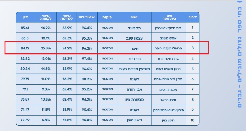 בחלוקה על פי בתי ספר גדולים מובילים, בית הספר הריאלי העברי בחיפה ניצב במקום השלישי בנתונים עבור גברים עם שיעור משוקלל של 84.12 אחוז, והוא גם בית הספר החיפאי היחיד ברשימה זו. את רשימת בתי הספר הגדולים מוביל בית החינוך ע"ש רבין בתל מונד (85.61 אחוז), בית הספר אסף משגב בעצמון (85.3 אחוז), בית הספר הריאלי, קריית החינוך דרור בבני דרור (82.82 אחוז), תיכון מכבים-רעות (80.34 אחוז), תיכון מור מטרו-ווסט ברעננה (79.75 אחוז), מקיף הדסים באבן יהודה (79.1 אחוז) תיכון הראל במבשרת ציון (76.87 אחוז), תיכון ע"ש אוסטרובסקי ברעננה (72.39 אחוז) ותיכון בגין בראש העין (72.39 אחוז).