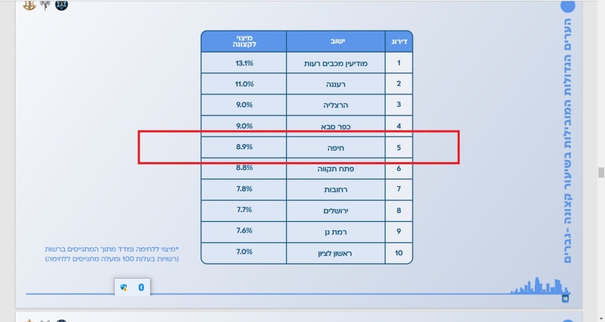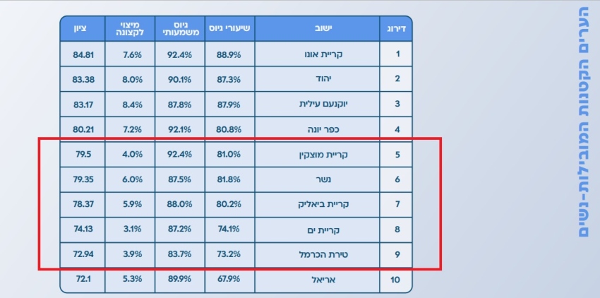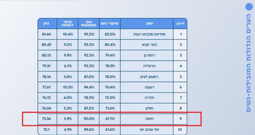 ברשימת הערים הגדולות המובילות במיצוי קצונה לנשים, חיפה ניצבת במקום השמיני עם 5.9 אחוז. את הרשימה מובילה מודיעין-מכבים-רעות (10.4 אחוז), ואחריה רעננה (10.3 אחוז), רמת גן (9.9 אחוז), כפר סבא (9.2 אחוז), בית שמש (8.9 אחוז), ירושלים (8.2 אחוז), הרצליה (6.1 אחוז), חיפה (5.9 אחוז), ראשון לציון (5.8 אחוז) ופתח תקווה (5.6 אחוז).