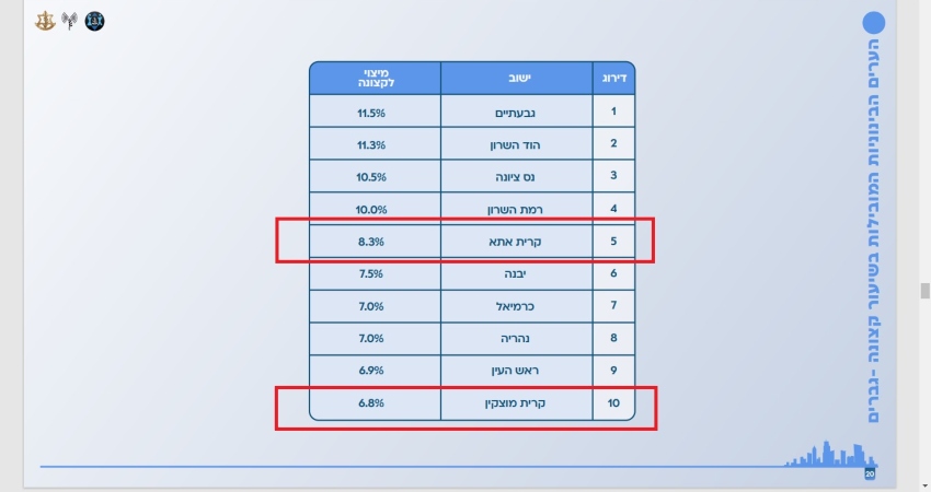 ברשימת הערים הבינוניות המובילות במדד מיצוי הקצונה עבור גברים, ניצבות קרית אתא במקום החמישי (8.3 אחוז) וקרית מוצקין במקום העשירי. גבעתיים ניצבת בראש (11.5 אחוז), אחריה הוד השרון (11.3 אחוז), נס ציונה (10.5 אחוז), רמת השרון (10 אחוז) קרית אתא, יבנה (7.5 אחוז), כרמיאל (7 אחוז), נהריה (7 אחוז), ראש העין (6.9 אחוז) וקרית מוצקין.