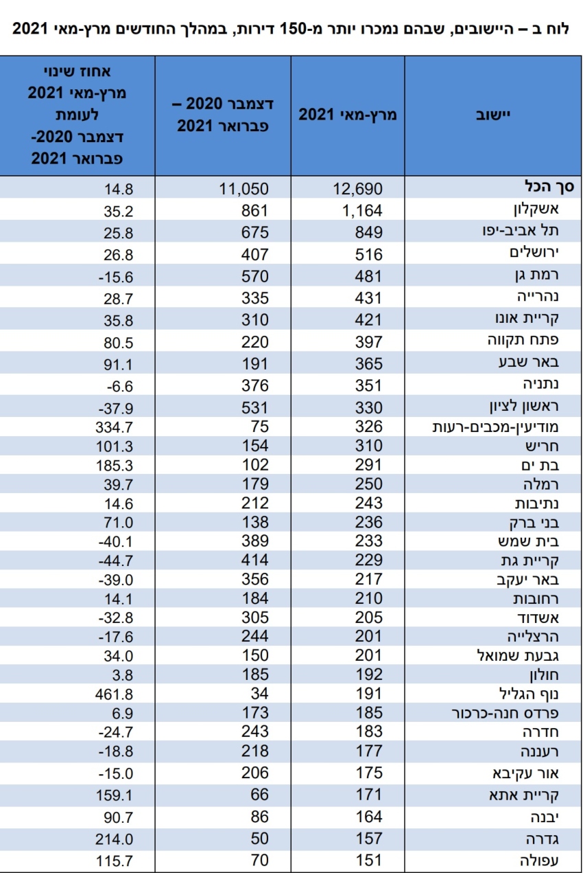 מנתוני הלמ"ס עולה, כי היישובים שעקפו את חיפה במספר הדירות החדשות שנמכרו בחודשים מארס-מאי בסדר יורד הם כדלקמן: אשקלון (1164 דירות), תל אביב-יפו (849), ירושלים (516), רמת גן (481), נהריה (431), קרית אונו (421), פתח תקוה (397), באר שבע (365), נתניה (351), ראשון לציון (330), מודיעין – מכבים-רעות (326), חריש (310), בת ים (291), רמלה (250), נתיבות (243), בני ברק (236), בית שמש (233), קרית גת (229), באר יעקב (217), רחובות (210), אשדוד (205), הרצליה (201), גבעת שמואל (201), חולון (192), נוף הגליל (191), פרדס חנה-כרכור (185), חדרה (183), רעננה (177), אור עקיבא (175), קרית אתא (171), יבנה (164), גדרה (157) ועפולה (151).