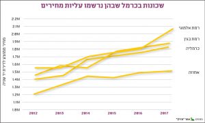 דירת 3 חדרים שנמכרה בשנת 2015 ב־1.5 מיליון שקל איבדה תוך שנתיים 20 אחוז מערכה ונמכרה ב־1.2 מיליון שקל בשנת 2017. דירת 4 חדרים שנמכרה ב־1.75 מיליון שקל ב־2015 איבדה “רק” 16 אחוז משוויה והגיעה למחיר של 1.47 מיליון שקל ב־2017. את המצב מצילות דירות 5 חדרים שכמעט לא איבדו מערכן בתקופה זו. ממחיר של 2.28 מיליון שקל הן ירדו ל־2.26 מיליון שקל.