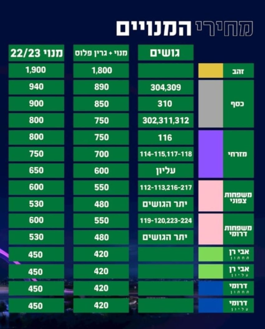 שלב ב': המכירה למנויים שמקום מושבם נלקח על ידי אופ"א תיפתח ביום שני בשעה 10:00. בשלב זה ניתן יהיה לרכוש מנוי על בסיס מקום פנוי עד יום רביעי בשעה 10:00. המקומות שנלקחו על ידי אופ"א: גוש 301 כולו; גוש 302, שורות 7-1 כיסאות 36-30, שורות 21-8 כיסאות 37-30; גוש 303, שורות 23-1; גוש 304, שורות 7-1, שורה 8 כיסאות 99-90, שורה 9 כיסאות 96-90; גוש 309, שורות 7-5 כיסאות 157-150; כסף פרימיום כולו; גוש 402, שורות 7-1 כיסאות 51-41, גוש 403 כולו, גוש 409, שורות 6-1 כיסאות 250-240, שורה 7 כיסאות 248-240.